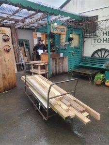 Collecting 2×4 from Bristol Wood Recycling Project. The whole lathe is made from recycled wood.