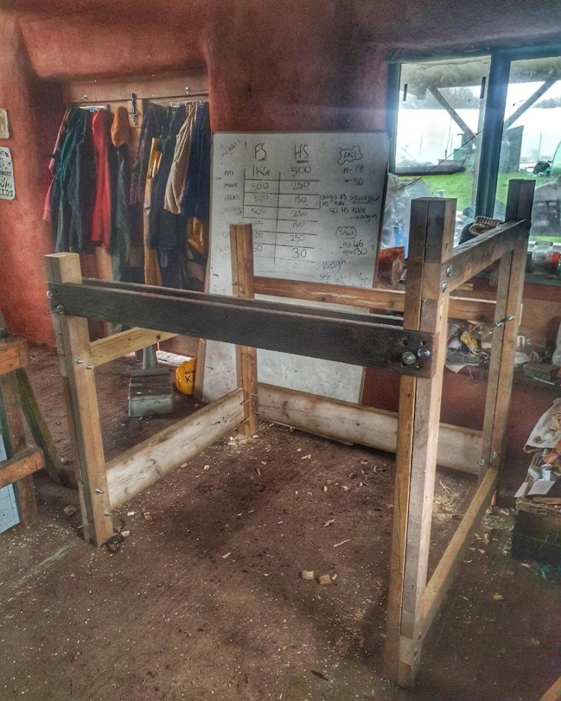 So firstly, why did I choose this path rather than adjusting what I already have? The first reason is that I want a lathe that can work on hard-standing, so not pegged down. The main reason though is that travelling between festivals and woodland workshops with a whole fleet of lathes is a pain in the proverbial backside. An ideal solution in my opinion, is that these workshops and festival spaces have a set of lathes built that are to the same design, thus meaning that tutors can travel around the country and teach at each site easily. I have been trialling this with Yoav and Flo both teaching in my workshop on lathes I’ve pre set up, and it seems to work very well. I know this may not happen immediately, and it may not happen at all (it is after all quite an investment of time and money), but it is my vision of how I could actually make a living from making and teaching the pole lathe. For sure I couldn’t keep moving my lathes around from a to b and back again! If all else fails, I shall just teach from my workshop in Bristol. A third reason is that I want to make life as comfortable as possible for beginner turners to encourage them into the craft. At this point, I would like to state that the existing flatpack lathes are still perfectly fine to turn on if you find them comfortable and adjust them for your height. It worked fine for me for five years. However I believe a pole lathe with a back rest should be used if you are turning as part of your income, as it means you’ll be turning bowls for longer before injury. I am also convinced that it is right that beginners are offered the chance to learn on a lathe with a backrest as I have a responsibility to make the first experience as comfortable as possible for my customers. It is also my experience that turning with a backrest allows you to be more efficient and turn for longer, particularly with bigger bowls.