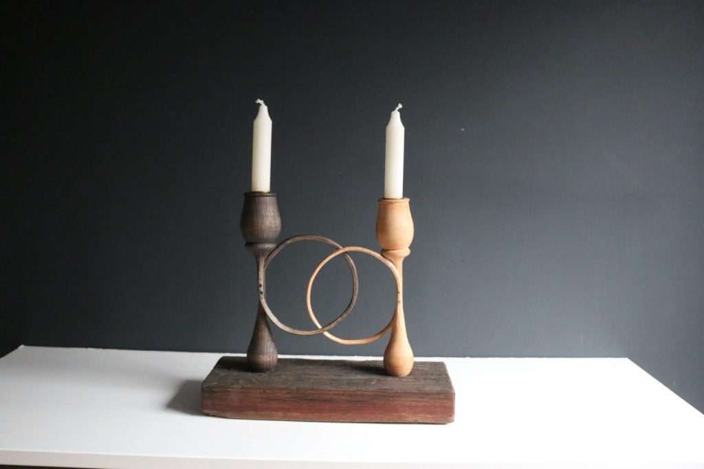 All the numbered Candlesticks are made by turning the flower and the blub of the tulip, then carefully thinning the stem down using a drawknife, before steam-bending the green wood into a form which makes up the frame of the candlestick. This is then left for a week and tenons are re-carved before assembly. Unless stated each has had the pinky-red, sandy bedrock of my workshop rubbed into their grain to highlight it and connect it to my space and processes.