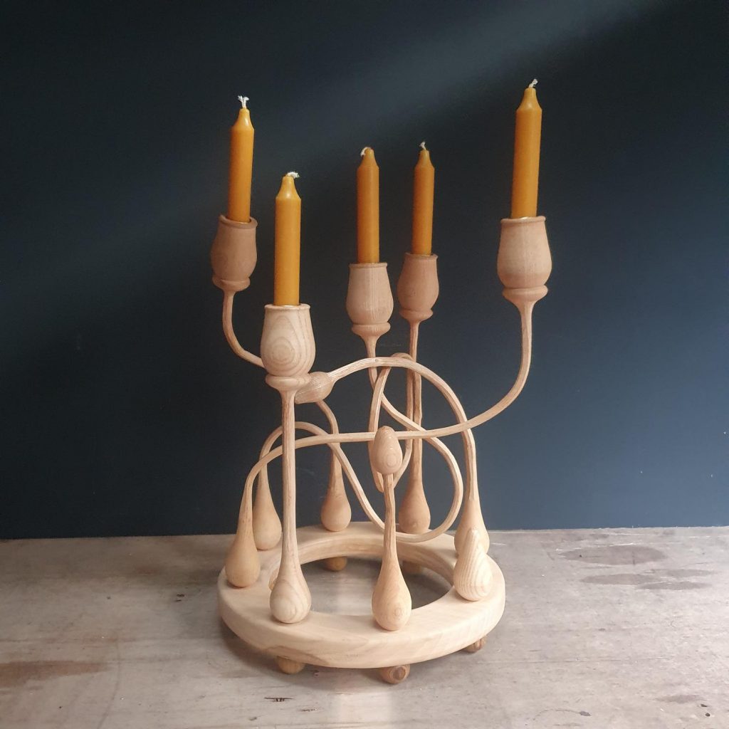 Candlesticks – An ongoing series of candlesticks inspired by the shape of a tulip. These candlesticks were first envisaged as an attempt to make something from wood that is typically made from metal, starting with the candleabra. The strength of the thin wood encouraged me to make more, with designs becoming increasingly organic.