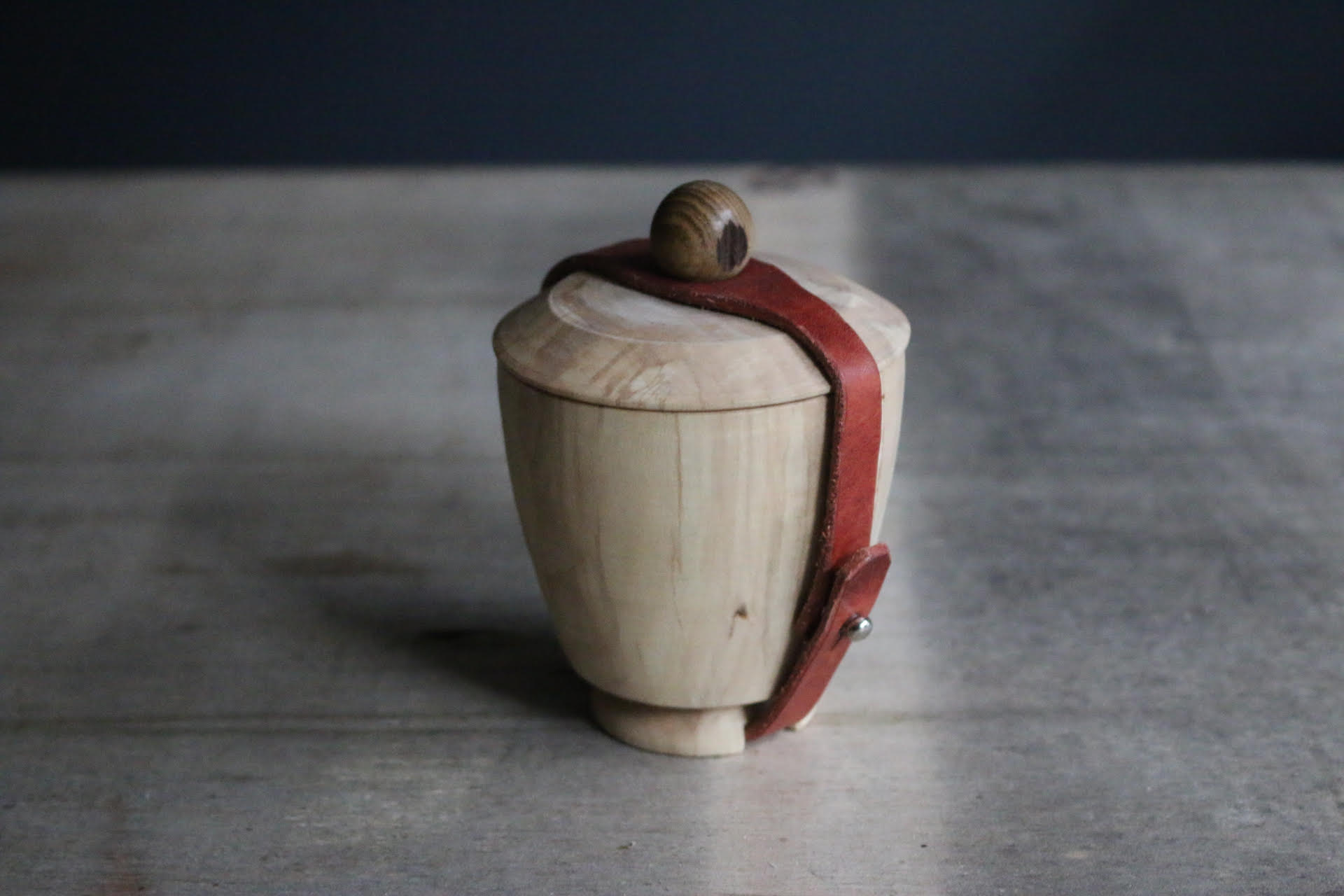 These are made on a pole-lathe from sycamore with a labernum finial and a veg-tanned leather strap fastened with a Sam Browne stud. The perfect size for a daily snack of nuts to slip into your bag.